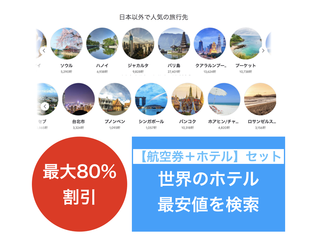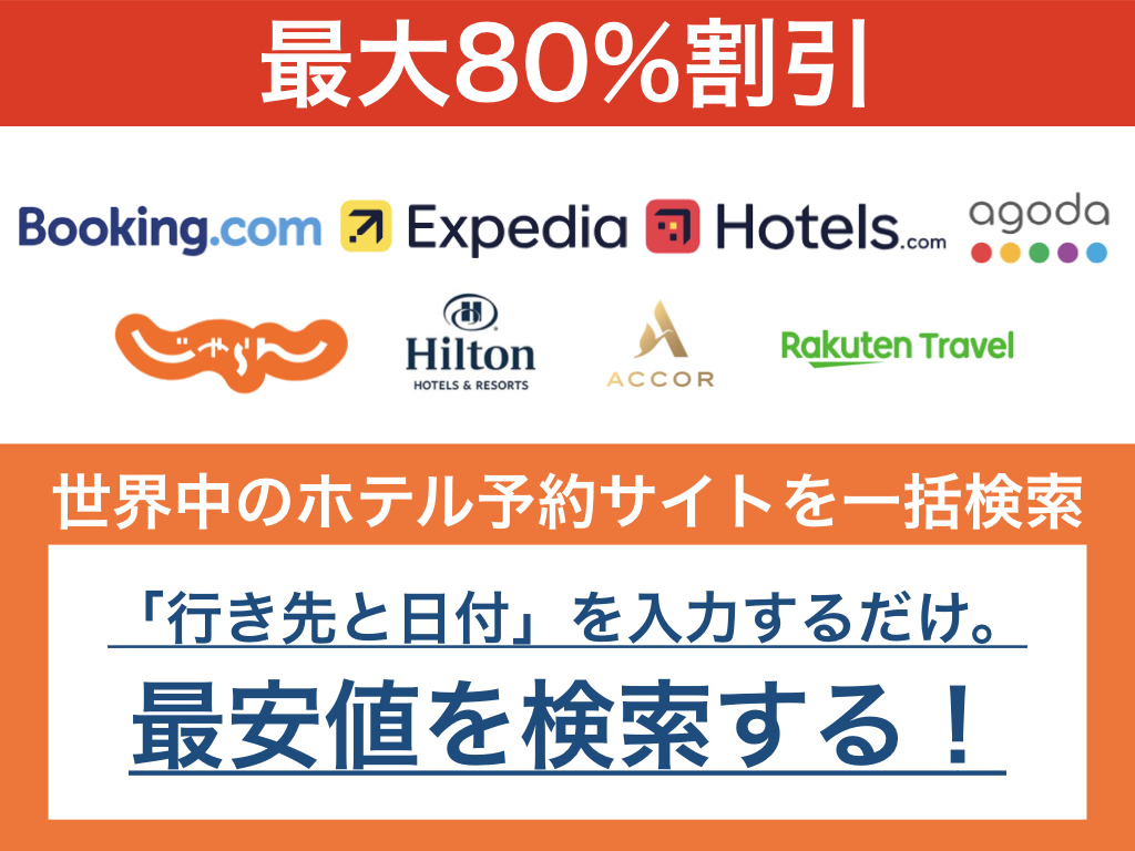 行き先と日付を入力するだけで簡単に最安値がわかります。世界中のホテル予約サイトを検索して最大80%割引の最安値保証付きです。その上、キャンセル無料で後払いもできますので早めに予約しても安心です。世界中の旅行者からのリアルな口コミをご提供し、またたった今予約が入った宿泊もチェック可能です。 世界中200万軒以上の中から理想の1部屋が見つかります。人気ホテルの格安プランも簡単に検索でき、すぐに予約可能です。またSALE料金も大変お得に安全にお支払いできます。ホテル予約は即時に確定でき、当日予約もOK。Go to トラベルキャンペーンサイトの検索機能は宿泊施設を比較して、よりお得な料金を見つけることができます。東京や大阪、名古屋、京都への旅行も目的地を入力するだけで素早く簡単に宿を見つけ出すことが可能です沖縄や軽井沢周辺には1週間以上の長期旅行にオススメの宿も多数ございます。ネット上の旅行ホテルなどの情報をひとまとめ!各社に寄せられる口コミを総合したホテル評価指数や、1400万枚の写真がホテル選びに役立ちます。
